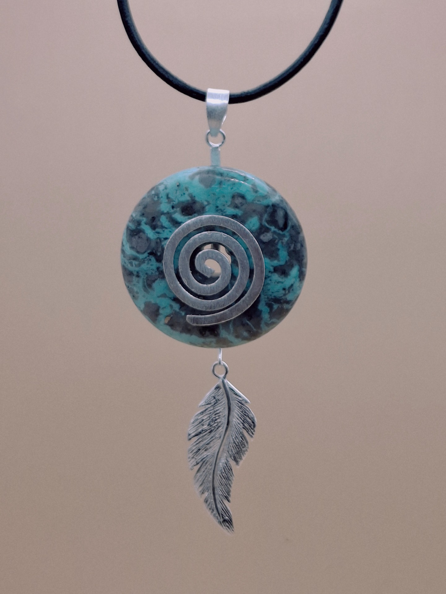 Echter Türkis Donut, handverlesen und mit 925 Silber in Form einer Spirale mit Federeinhänger am Lederband zu einem einzigartigen Schmuckstück gefertigt.
