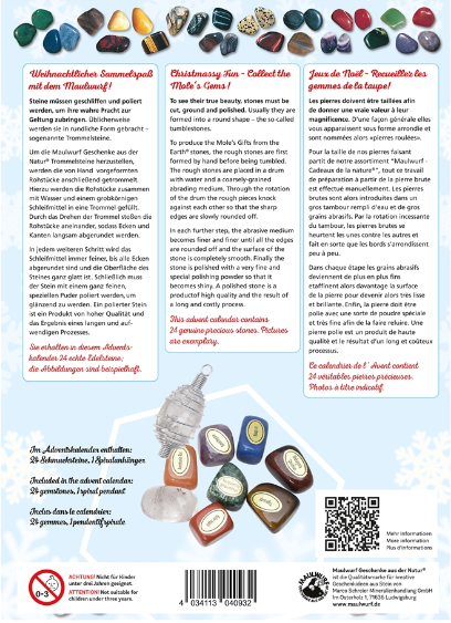 Auf der Rückseite des Kalenders erwarten dich spannende Infos über das Schleifen und Verarbeiten der Steine, verfügbar in drei Sprachen (Deutsch, Englisch, Französisch), damit du noch tiefer in die Welt der Edelsteine eintauchen kannst.