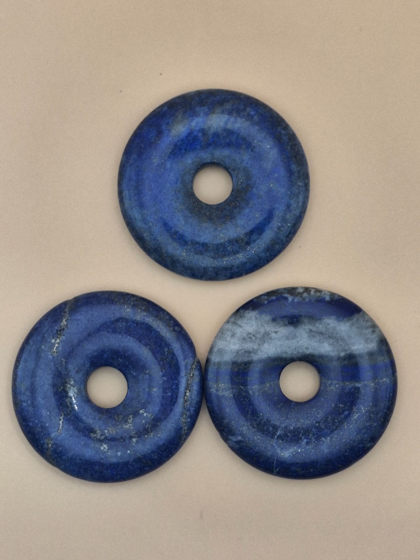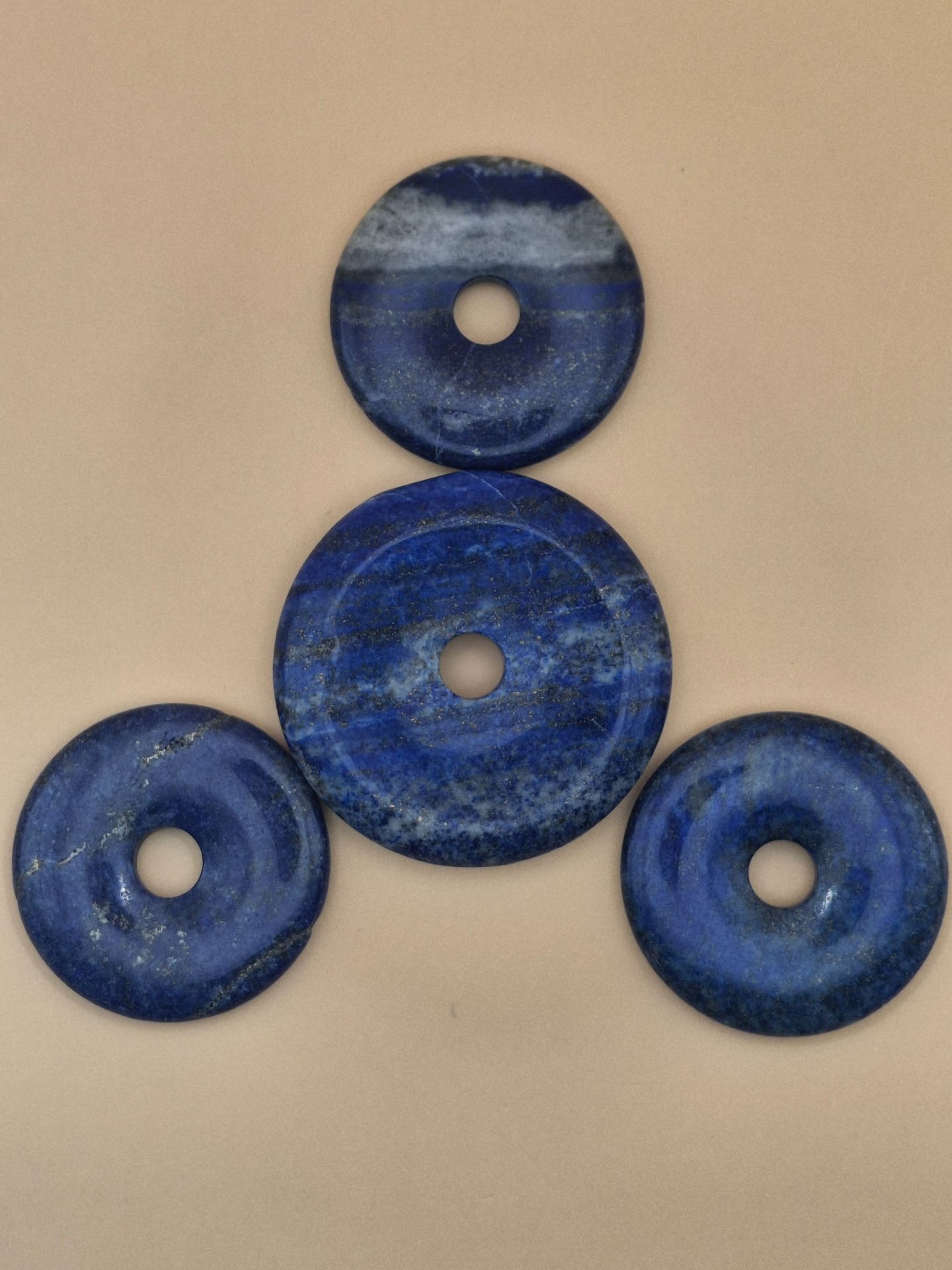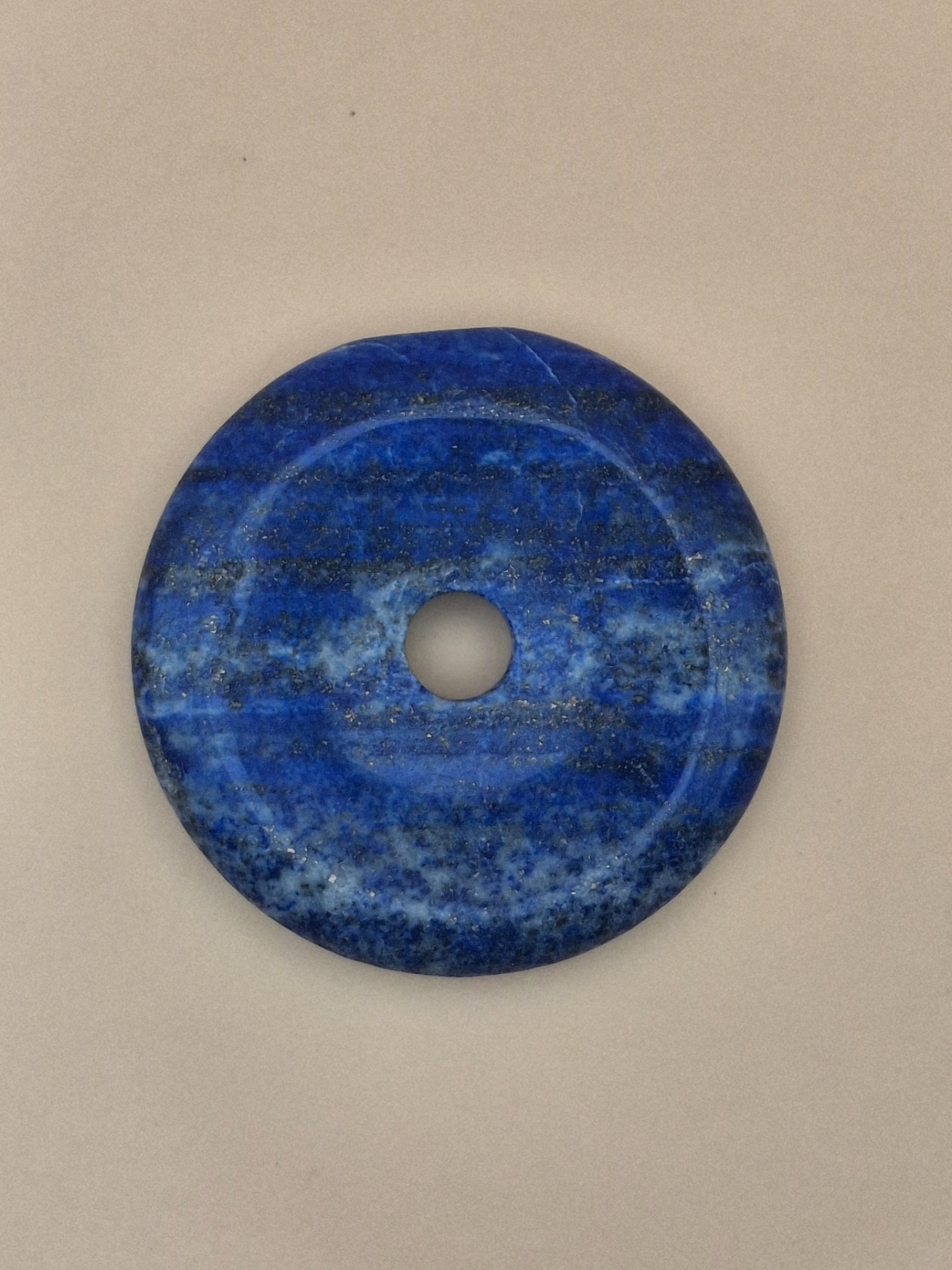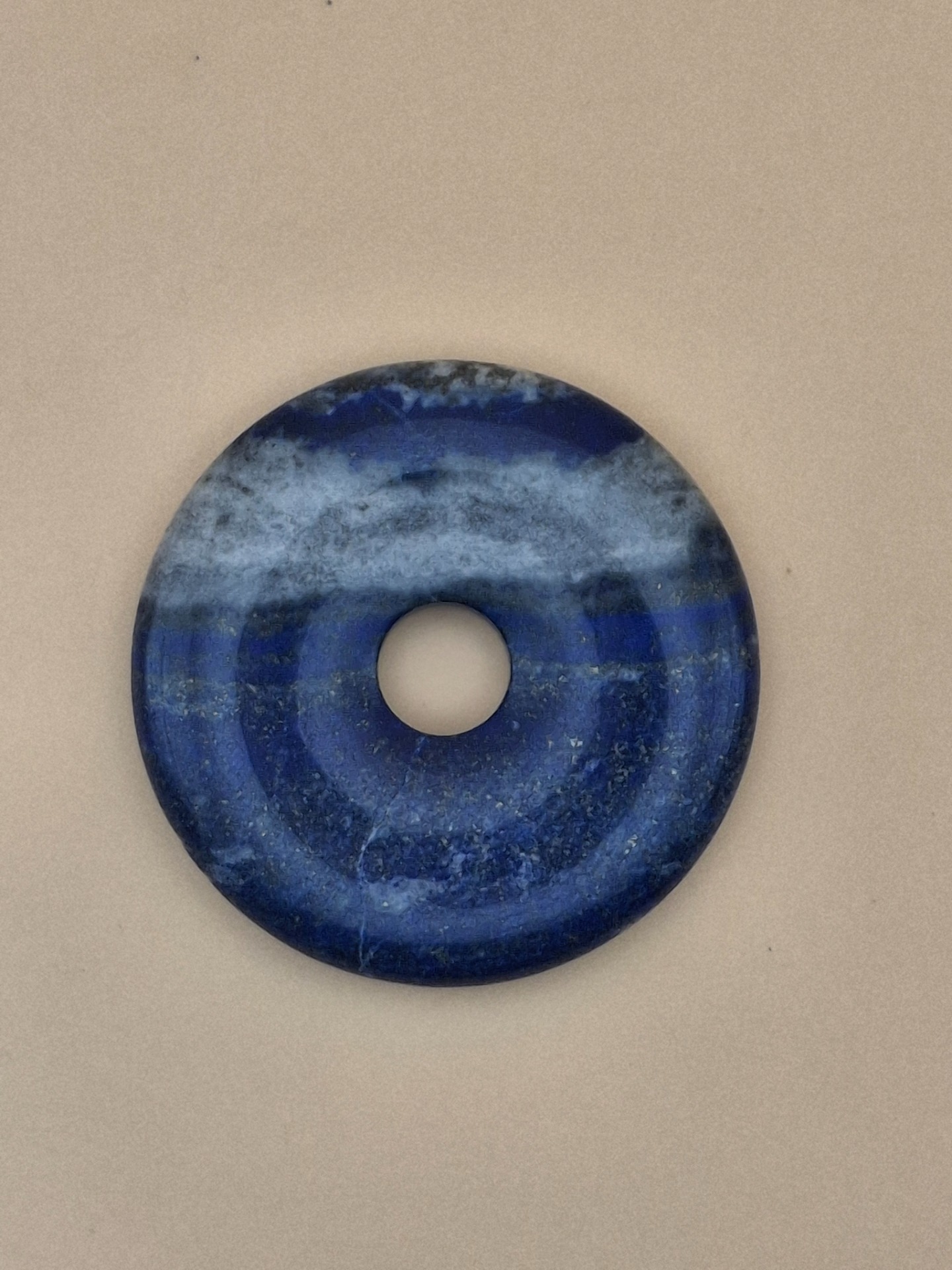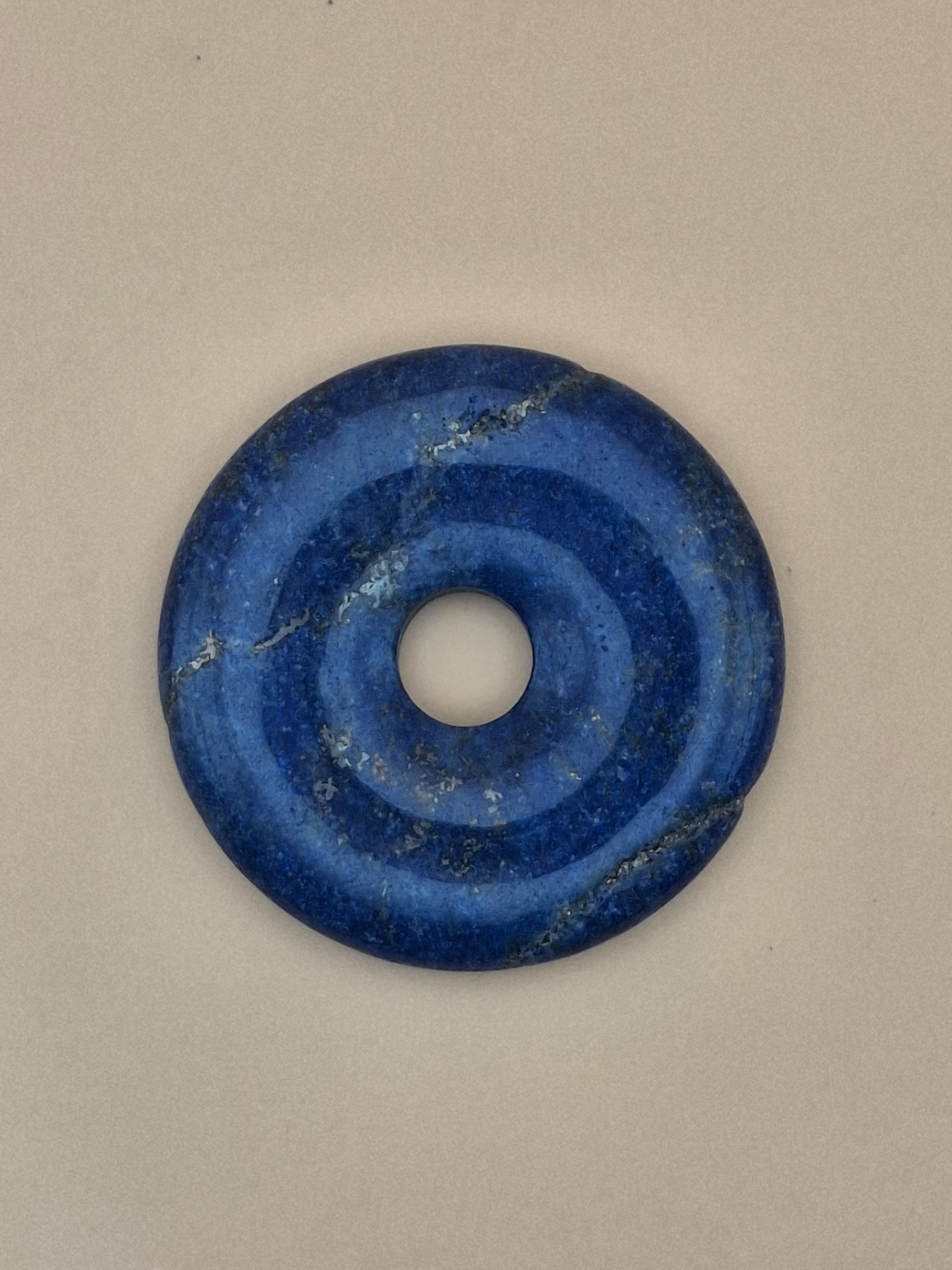 Dieser edle Lapislazuli Donut besticht durch sein tiefes Blau, das seit Jahrtausenden als Symbol für Weisheit, Wahrheit und spirituelle Erkenntnis gilt. Der Name Lapislazuli leitet sich von den lateinischen Begriffen „Lapis“ (Stein) und „lazulum“ (blau) ab. Bereits vor über 9000 Jahren wurde Lapislazuli schon als Schmuckstein und Kultobjekt verehrt.
