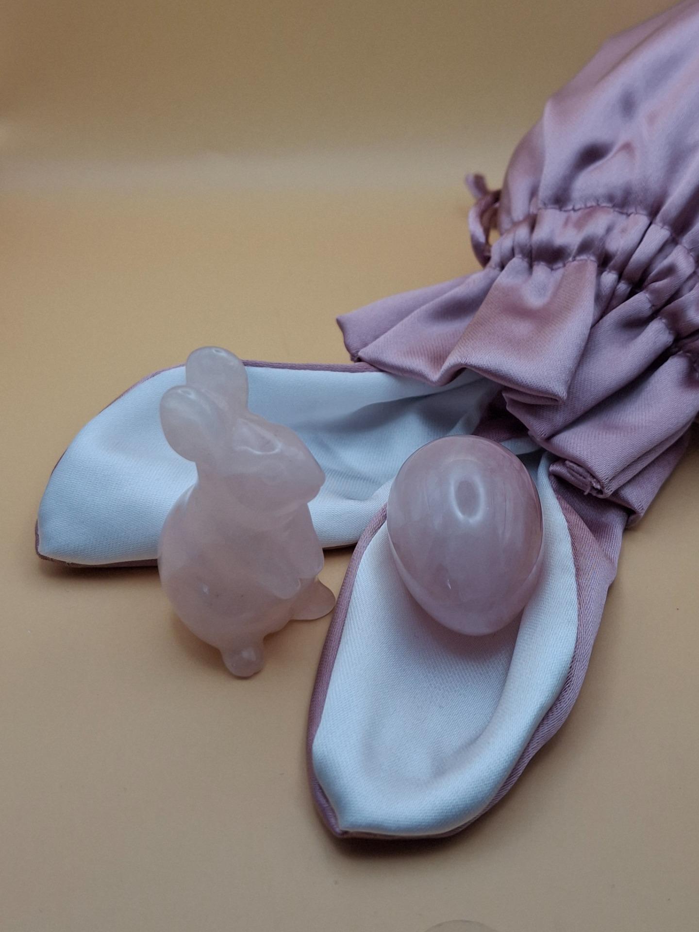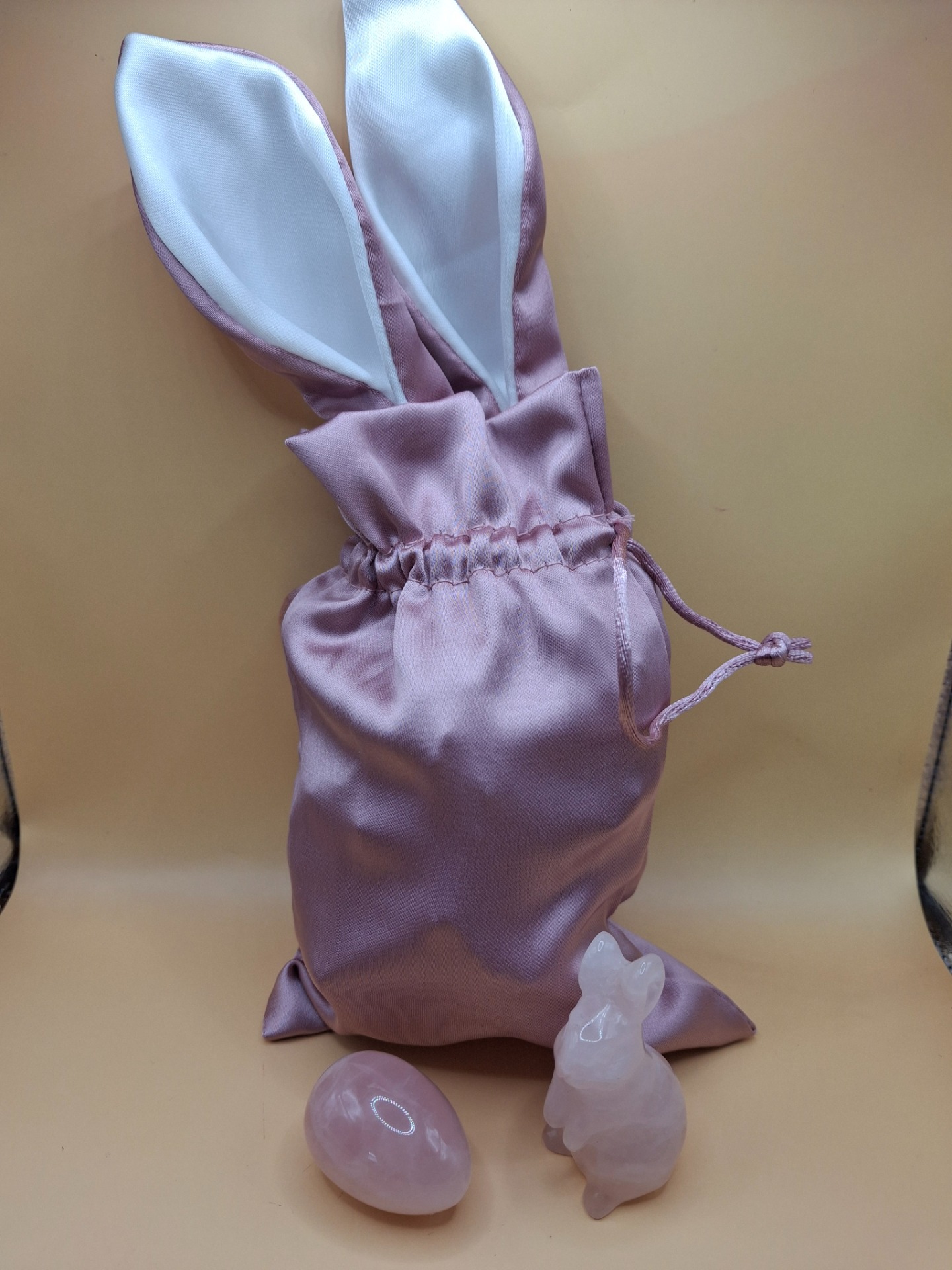 Ein Rosenquarz-Hase (ca. 4,7 x 2,7 cm) und ein Rosenquarz-Ei (ca. 3,5 x 2,5 cm, Gesamtgewicht 335,5 ct) werden in einem rosafarbenen Stoffbeutel mit Osterhasen-Ohren (ca. 23 x 11 cm) präsentiert. Der Beutel lässt sich praktisch verschließen und ist bereit für eine besondere Überraschung.