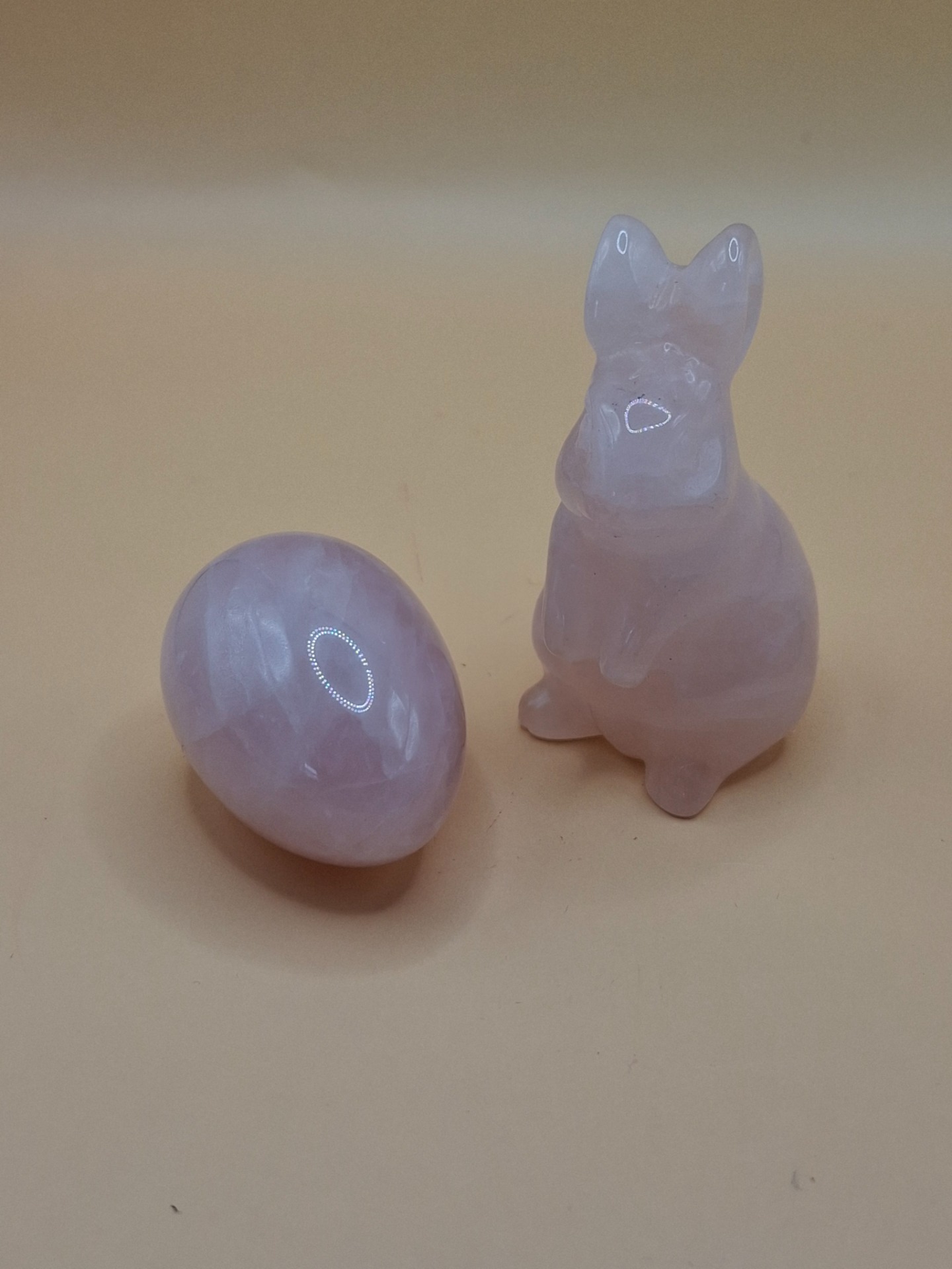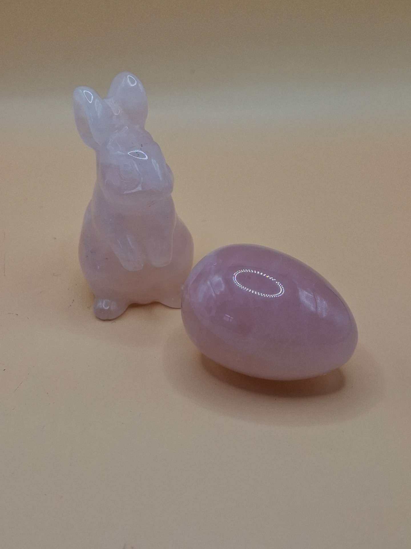 Lieferumfang: 1x Rosenquarz-Hase, 1x Rosenquarz-Ei, 1x rosafarbenen Stoffbeutel mit Hasenohren