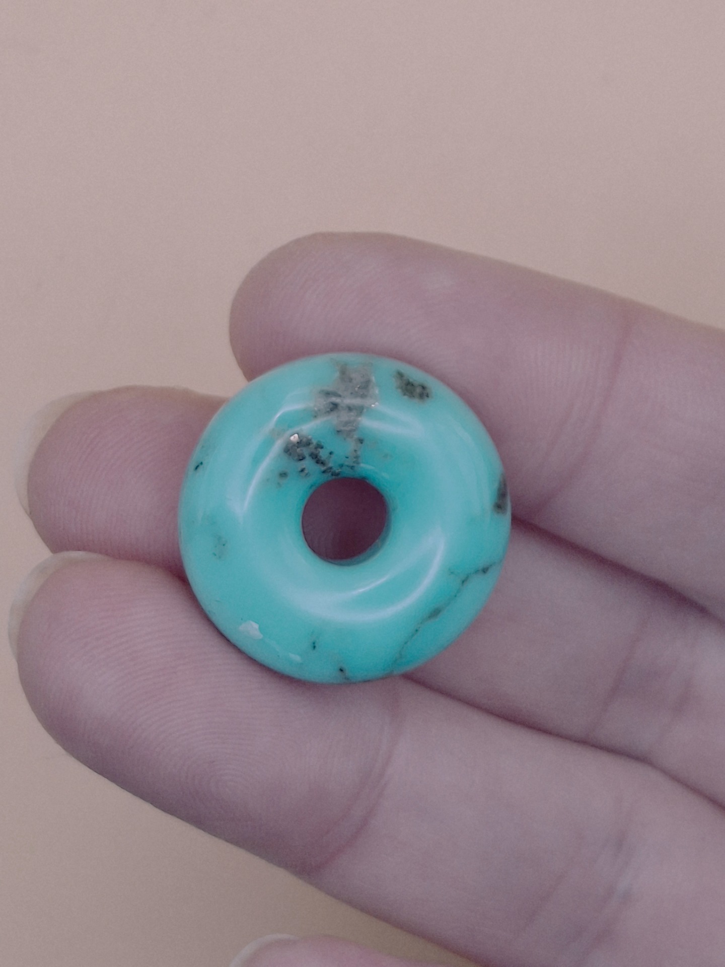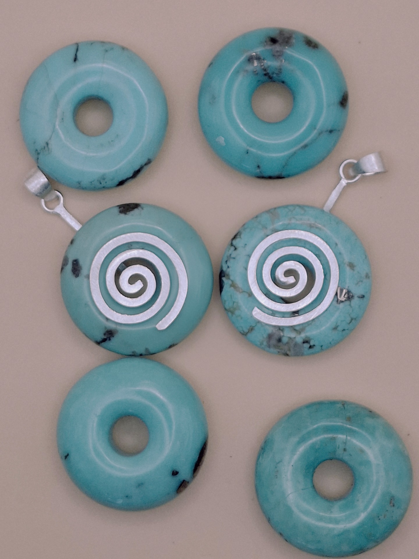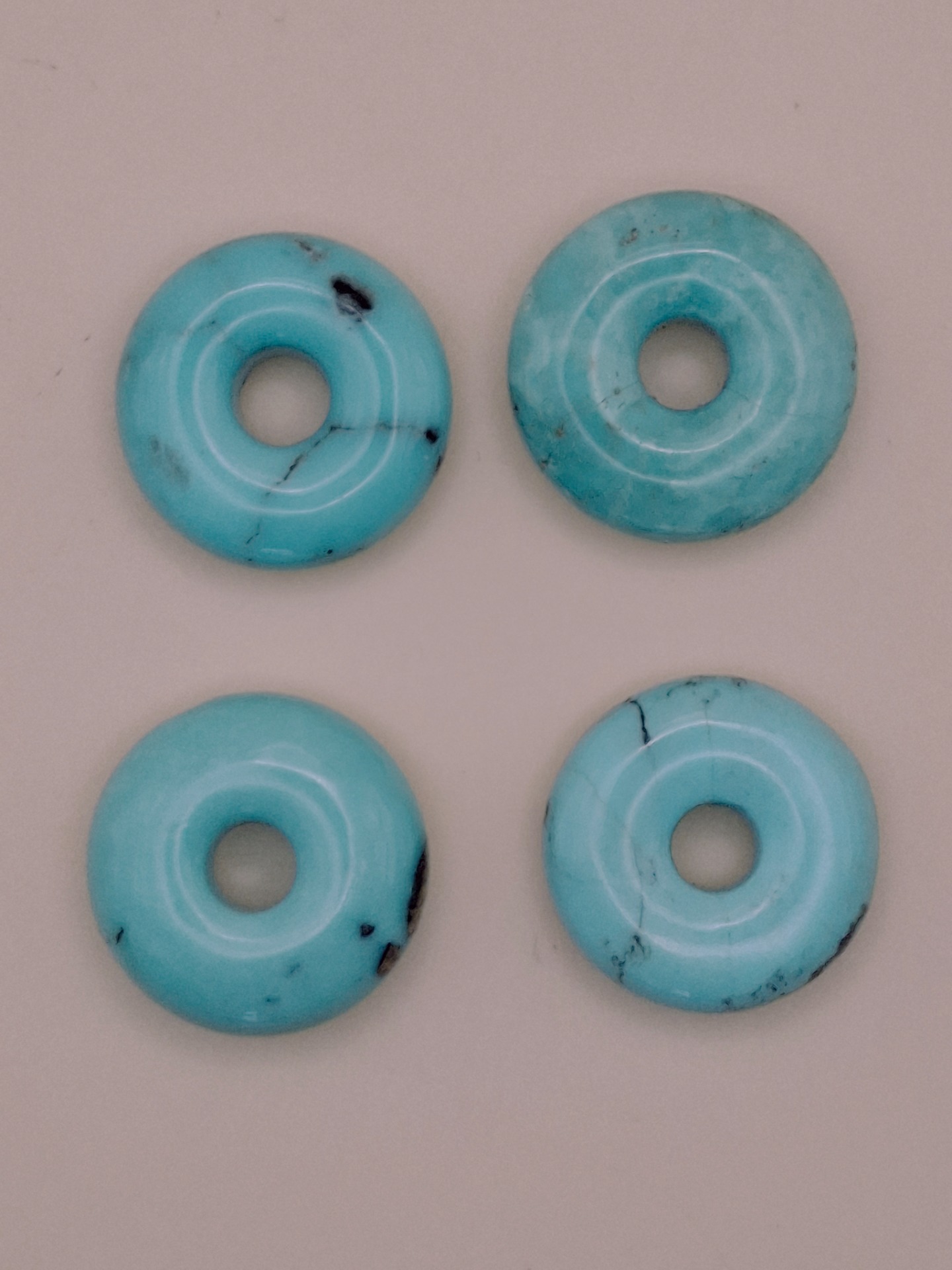 Diese Türkis Donuts sind echte Unikate, die durch sehr seltene, besonders helle und klare Farbqualität besticht. Solch hochwertige Türkise sind im Großhandel nur äußerst selten zu finden und machen diese Donuts zu besonderen Schmuckstücken für Sammler und Liebhaber.